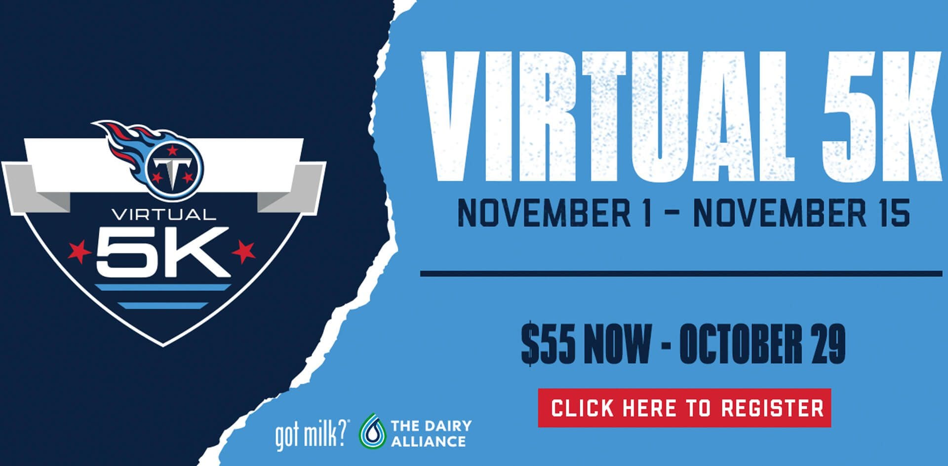 Run, walk, or jog the Titans Virtual 5K any time between Sunday, November 1 through Sunday, November 15.