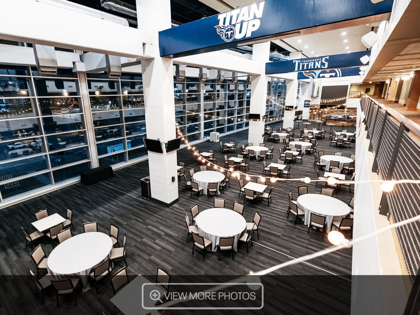 The only view better than the one from our West Club, is from our West Upper Deck! Experience the excitement of Broadway from just on the other side of the river on one side, while overlooking the Titans field with your logo on the stadium jumbotrons on the other side. This rental includes our available inventory of a portable bar, (20) 24” high top tables, and (30) gunmetal barstools. This is the perfect outdoor space for a cocktail hour, reception, or intimate ceremony.